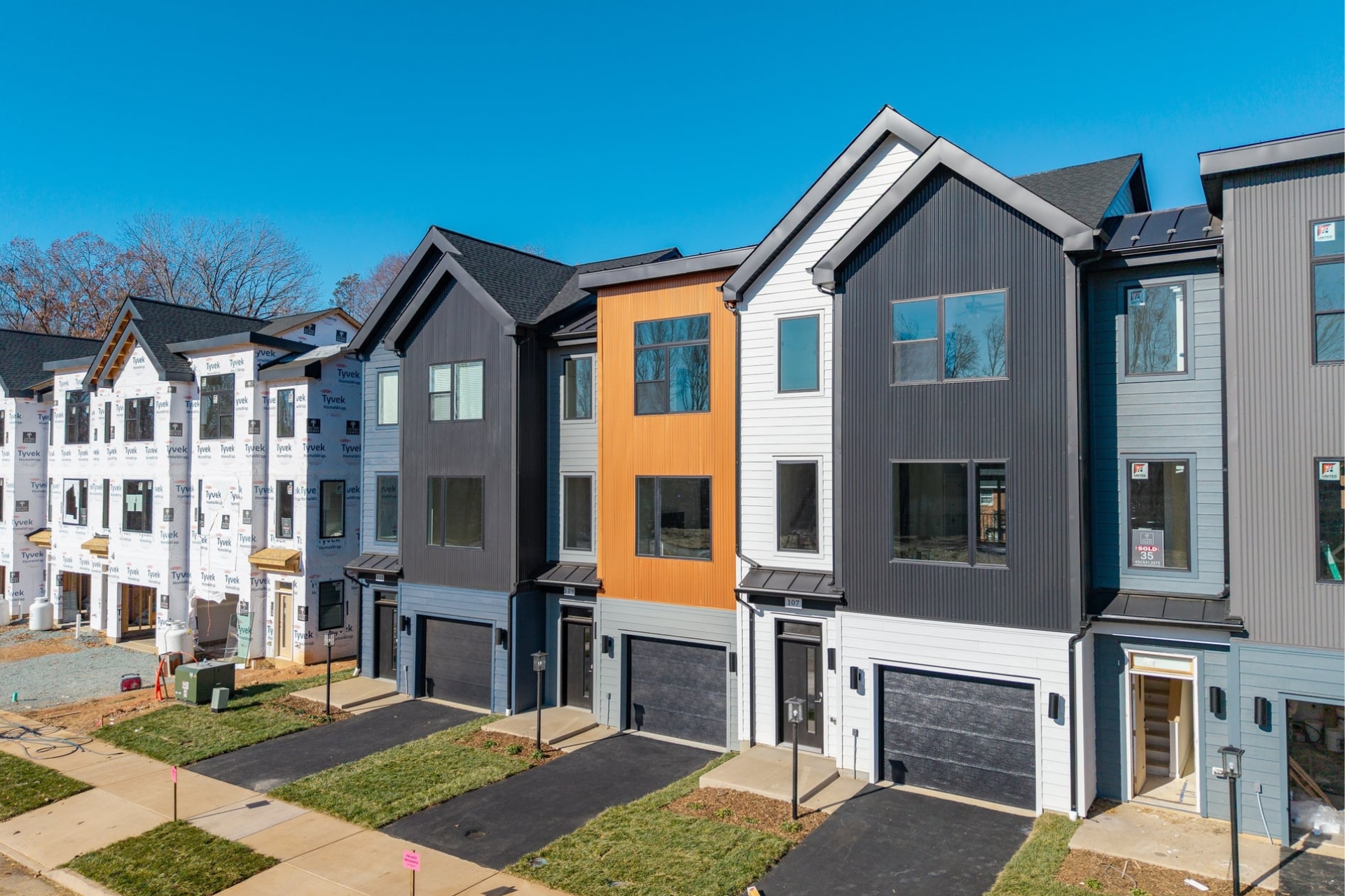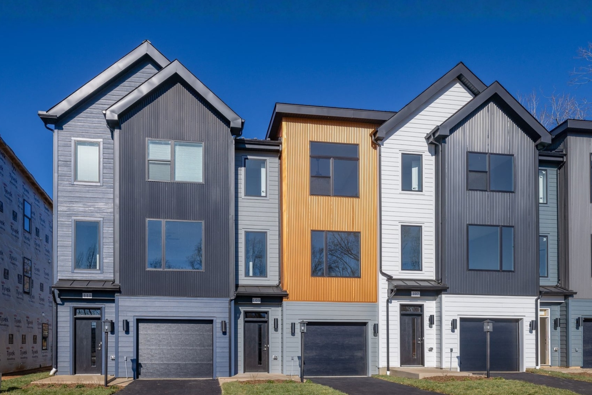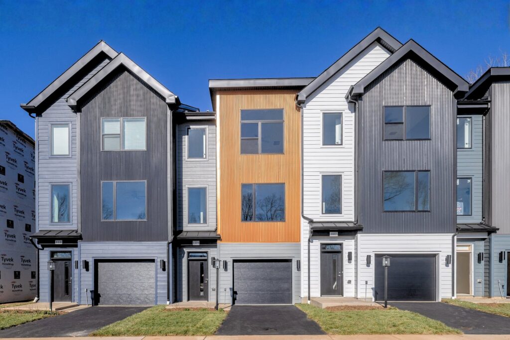 The Hinton is a contemporary townhome featuring James Hardie siding with complementary accents of corrugated metal panels, creating a cohesive and modern exterior. The entry-level provides flexibility with options for a bedroom, recreation room, or additional storage space, along with the choice of a full or half bath. This level also includes a convenient 1-car attached garage.